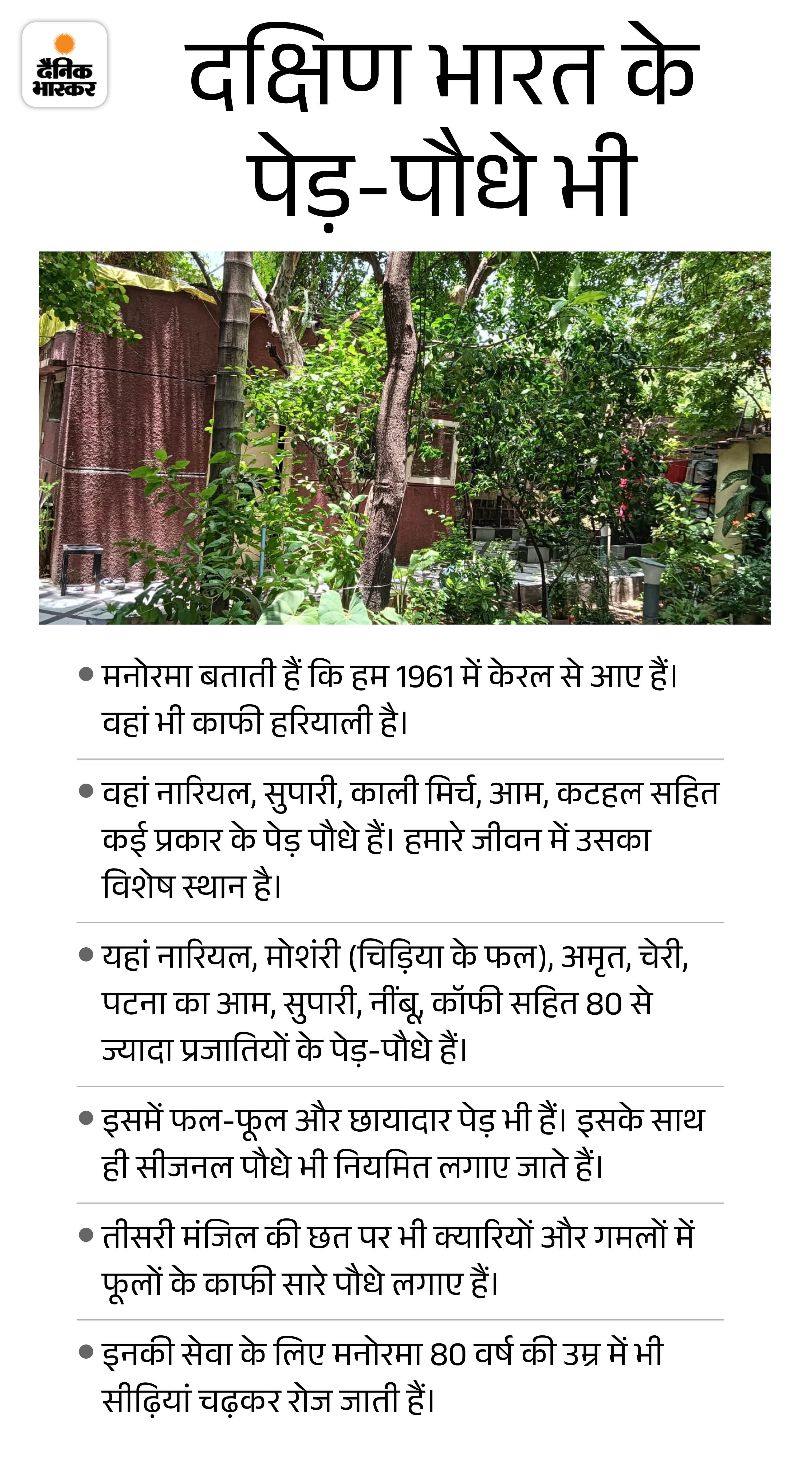 सबसे पहले बात पद्मश्री कुट्टी मेनन के घर की मेनन का पेड़-पौधों से ऐसा प्रेम रहा कि उन्होंने अपना पूरा जीवन ही जैविक कृषि को दे दिया। इसकी शुरुआत उन्होंने अपने घर से ही की। 3 में से 2000 स्क्वायर फीट पेड़-पौधों के लिए सुरक्षित किया। हर साल, हर मौसम में खूब पेड़-पौधे लगाए और उनकी सेवा की। इसमें पत्नी भी घर की जिम्मेदारियों के साथ सहयोग करती थी। चार साल पहले पर्यावरणविद पति की मौत हो गई, लेकिन पत्नी ने उनके सेवा कार्य को जारी रखा।
