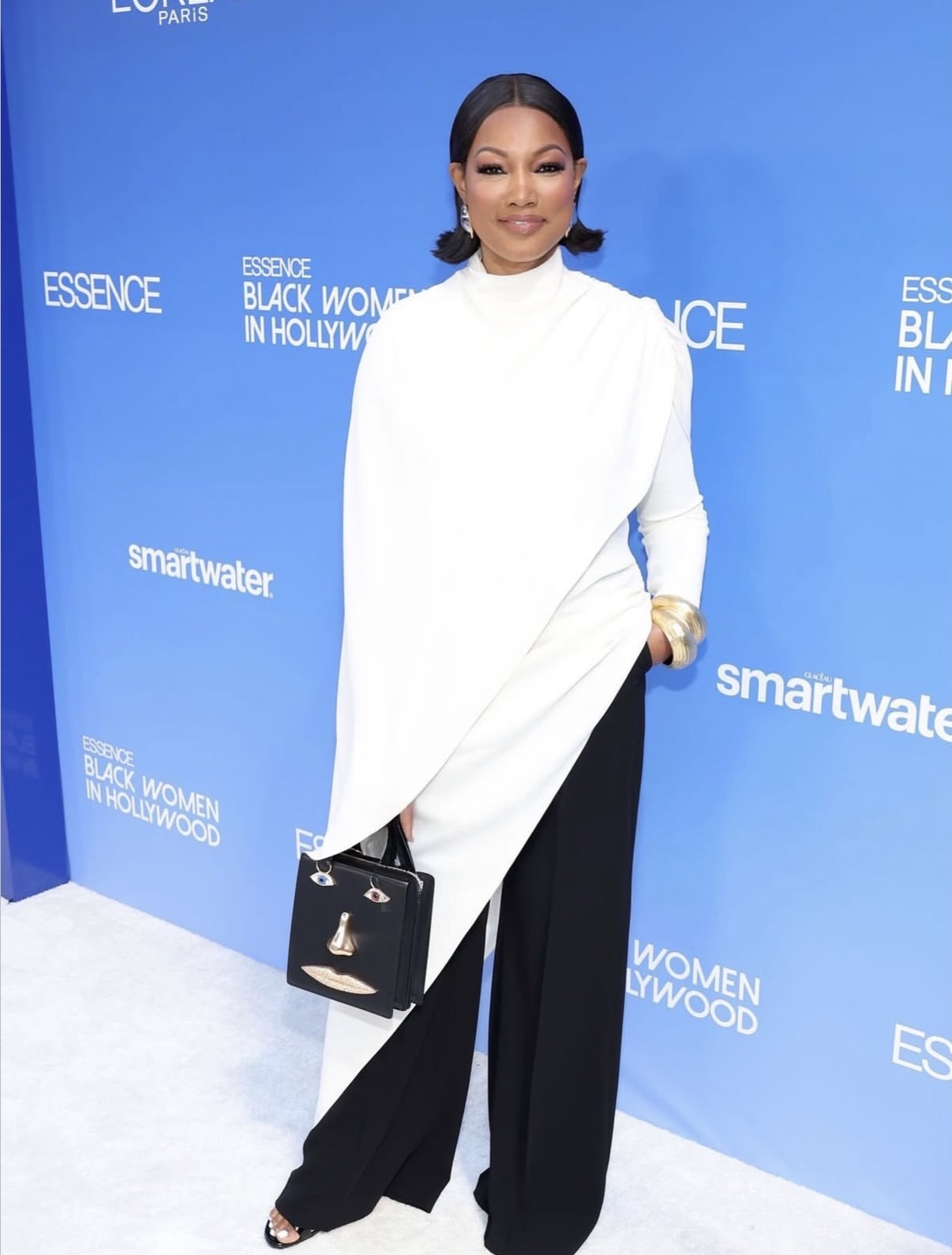 At the Essence Black Women in Hollywood Awards, Garcelle Beauvais embraced contrast through draping. She paired a fluid white asymmetrical top with tailored black wide-leg trousers, creating movement while maintaining structure. A statement Schiaparelli handbag added a bold finishing touch.