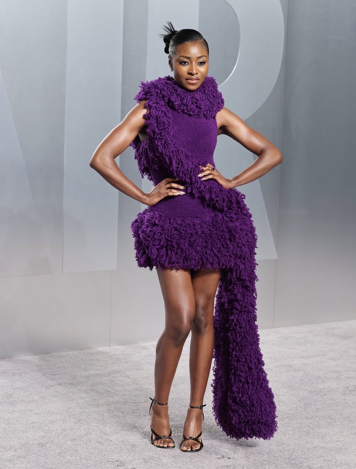 Jayme Lawson brought texture and movement to the forefront of the Vanity Fair party in a vibrant purple Loewe mini dress featuring fringe details. The high neckline and sleeveless cut lent a girly vibe, while a sculptural knot at the waist extended into a long trailing sash. She opted for black strappy heels to ground the dramatic design.