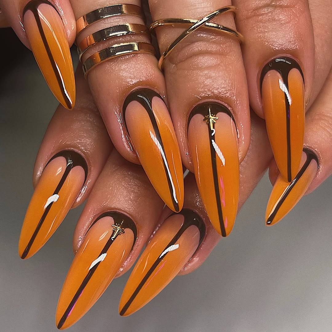 Every shade of orange gets its moment here—from burnt pumpkin to sunset gold. Abstract swirls or tiny smiley art keep things playful and bright. The warmth of this palette instantly draws attention and brings cheerful energy to your overall look.