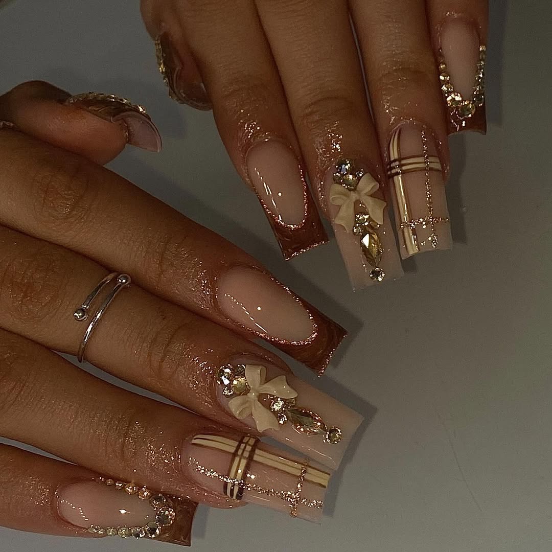 Nails that double as accessories? Yes, please. Crystals, metallic studs, or dainty floral gems layered over a nude base strike the perfect balance between simplicity and luxury. Every hand movement catches the light and exudes effortless style.