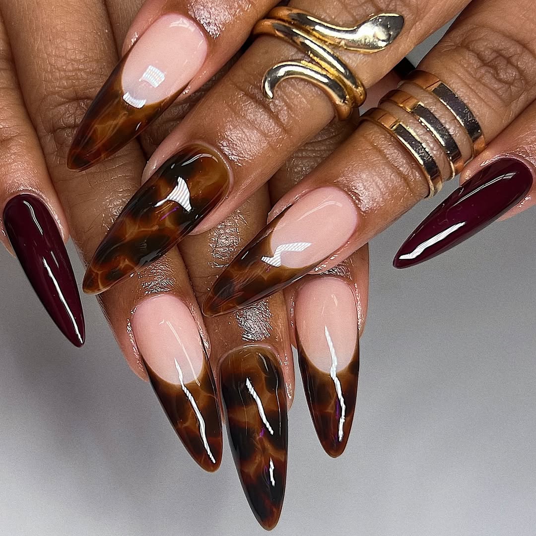 Rich swirls of honey, amber, and chocolate brown create a natural, glossy depth that feels luxurious yet grounded. Tortoise nails bring texture and tone without needing extra decoration, making them perfect for those who love quiet sophistication.