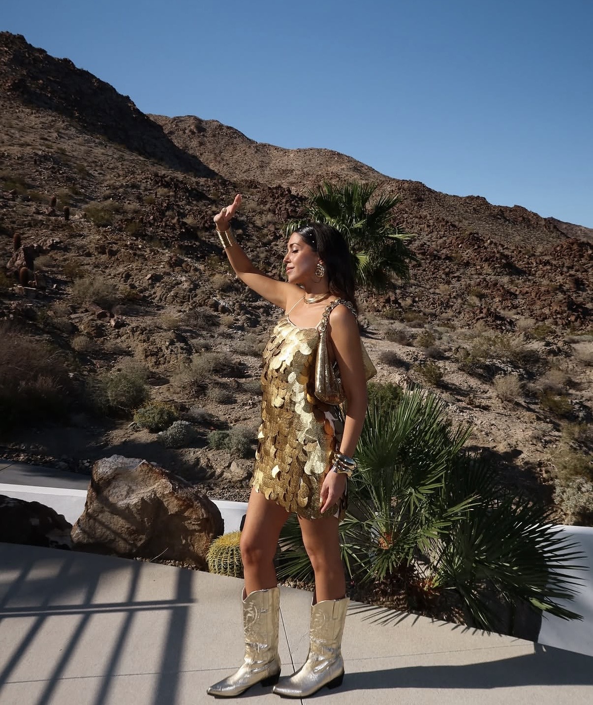 Metallic textures command attention under the desert sun, especially when layered in sheer, fluid silhouettes. A floor-length net dress or chainmail-style piece worn over a bralette and briefs, finished with a classic cowboy hat, creates a striking contrast between futuristic shine and Western attitude. Among the many looks surfacing across the 2026 Coachella polo fields, this combination reflects how women are pushing boundaries with daring textures and statement accessories.