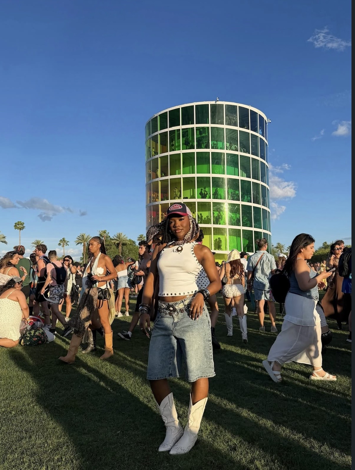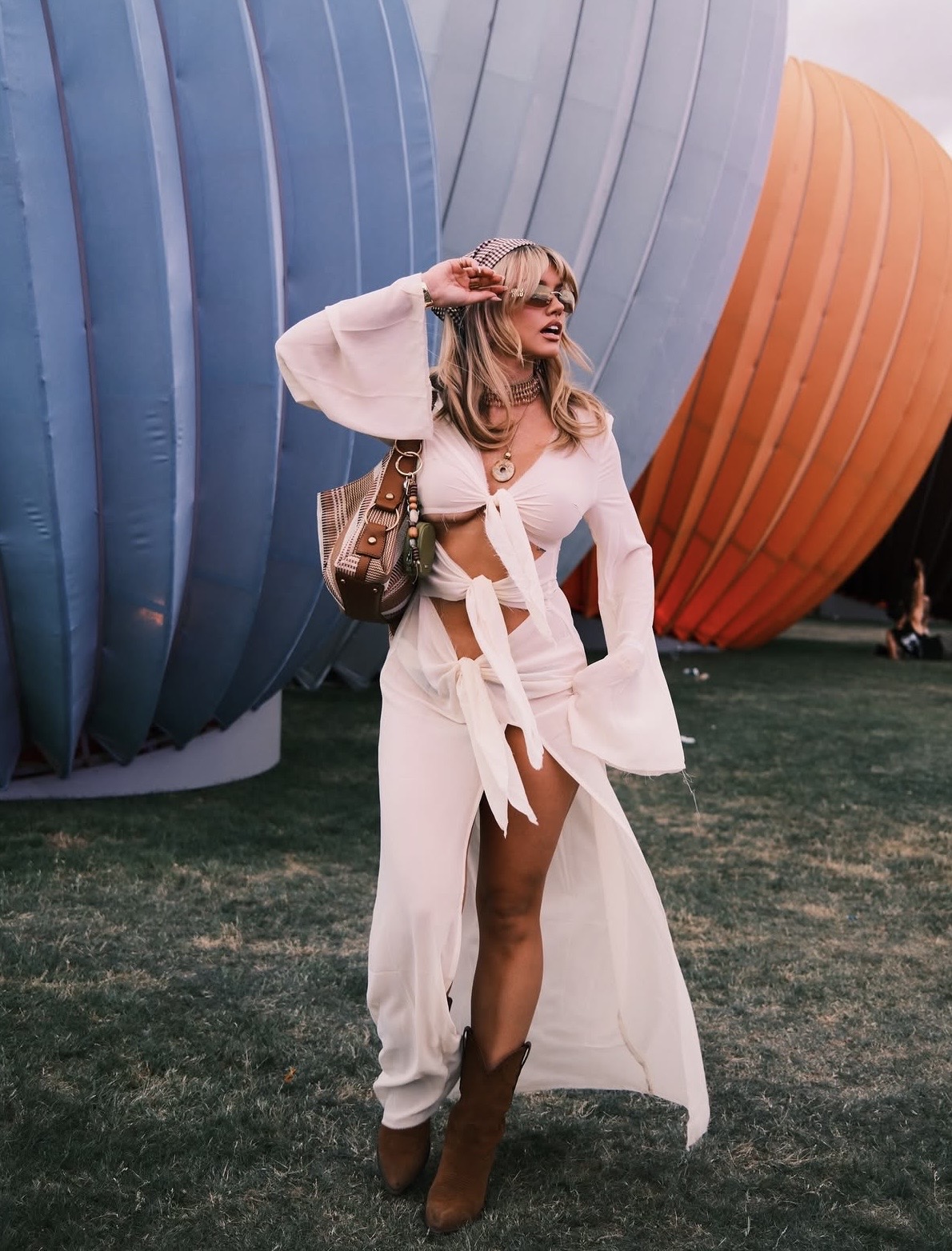 Relaxed tailoring is emerging as a major festival direction this year. A lightweight tie-front top paired with breezy wide-leg pants creates movement while allowing airflow during long afternoons under the desert sun. Finished with bold Western-inspired accessories, like statement belts or oversized buckles, the outfit carries an easygoing, desert-nomad energy that’s practical and polished.