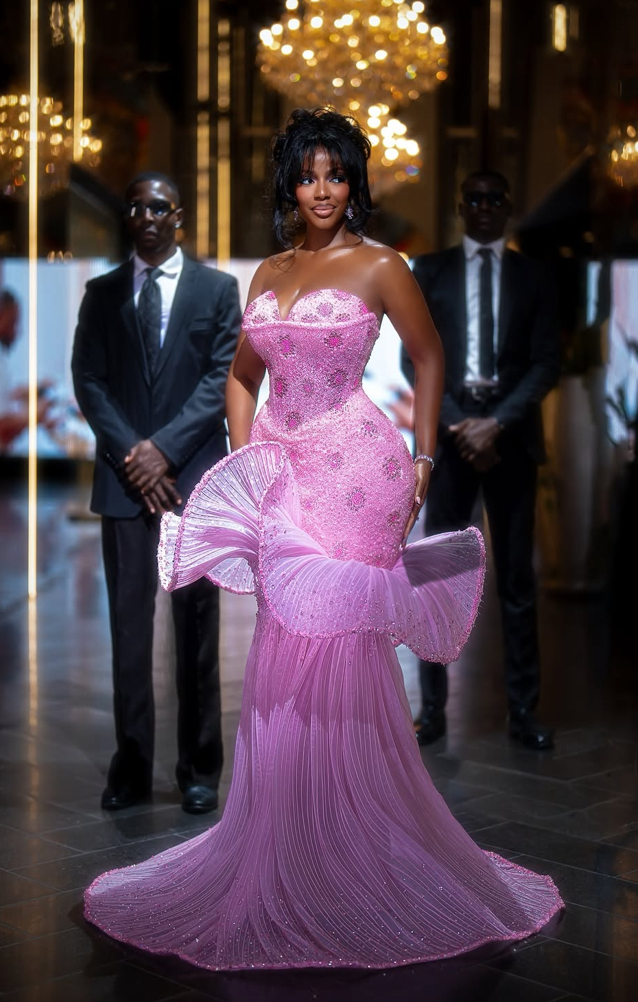 When Hilda Baci celebrates, she makes sure to dominate headlines. Marking her birthday and another Guinness World Record, she wore a sculpted pink gown that spoke volumes. The beaded bodice shimmered with precision, while pleated fan details added drama in motion. Flanked by suited guards, Hilda radiated power and elegance in equal measure. This wasn’t just a look; it was a performance, proving that style can be as commanding as it is celebratory.