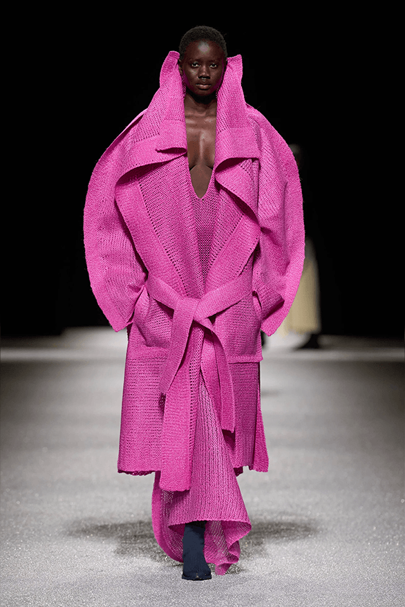 On the runway, exaggerated proportions dominated the silhouettes. Massive shoulder jackets and protective outerwear appeared shaped by imaginary natural forces. Meanwhile, accessories such as staff-carried bags and oversized headpieces hinted at ceremonial dress traditions.