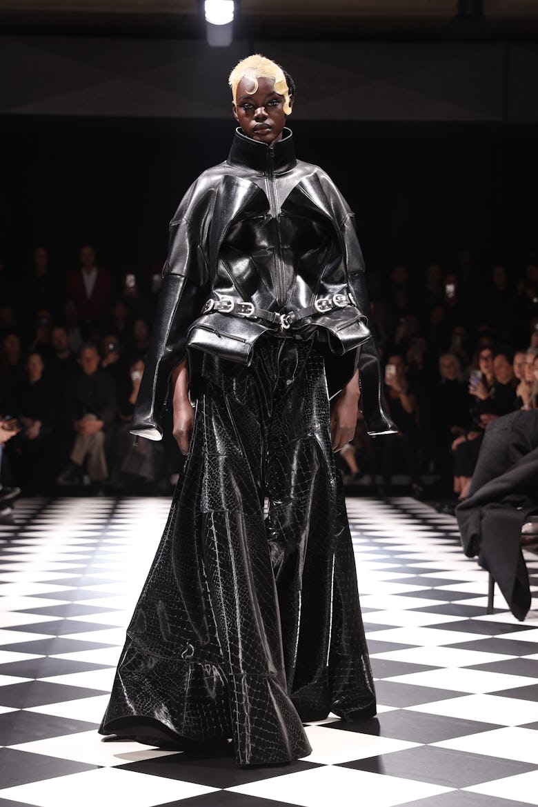 Sharply cut suits and coats featured elaborate collars reminiscent of classical Flemish portraiture, blending historical inspiration with modern precision. Velvet dresses with daring thigh-high slits introduced an element of rebellious elegance, while leather accents on pockets and ties strengthened the structured aesthetic.