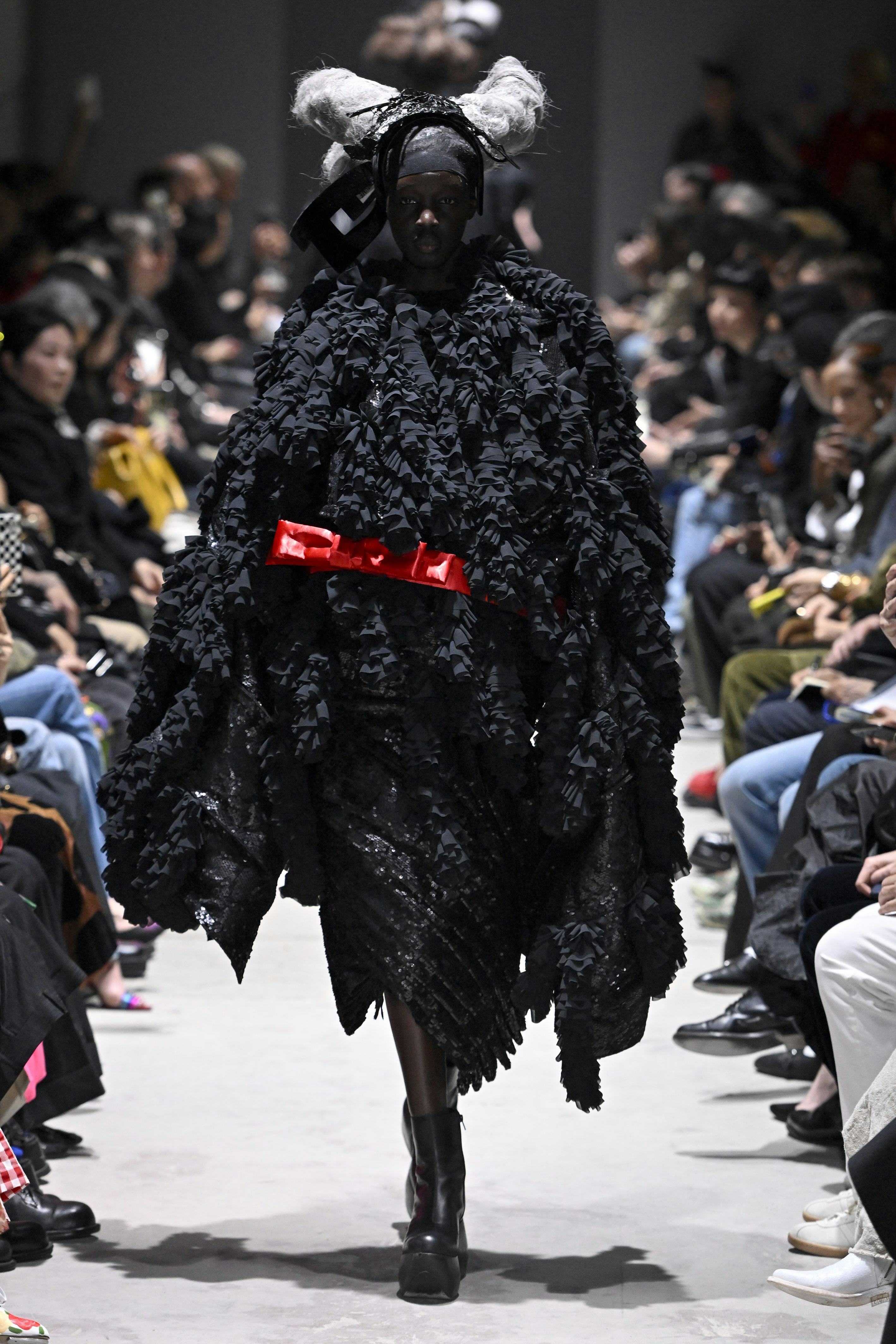 On the runway, exaggerated proportions dominated the silhouettes. Massive shoulder jackets and protective outerwear appeared shaped by imaginary natural forces. Meanwhile, accessories such as staff-carried bags and oversized headpieces hinted at ceremonial dress traditions.